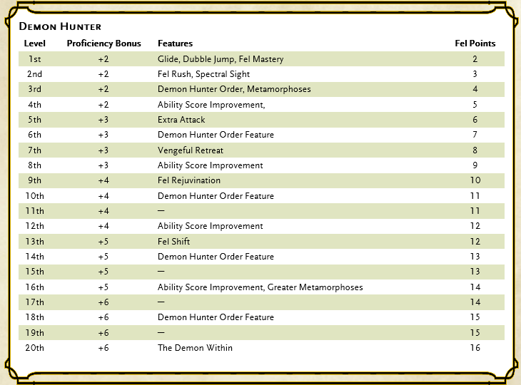 You have several fel points as shown in the fel point table. You can use those fel points to fuel your demon hunter ability’s. You regain all expanded Fel Points when you Finish a long rest.